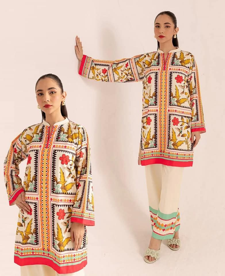 xThis cord set features a vibrant, traditional-inspired floral and geometric print. The top is a long-sleeved tunic with a round neckline, predominantly in warm yellow, pink, orange, and black tones, decorated with intricate motifs and vertical patterned panels for a slimming effect. The matching wide-leg pants have a black base with scattered floral motifs, bordered with the same patterned design as the top, creating a coordinated and harmonious look. Both pieces are finished with a hot pink edging, adding a bold and lively touch.